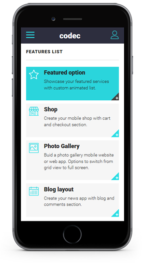 Codec is an HTML mobile template created for a mobile website, web app, and integrated with solutions like phonegap, for a real native app. It is build using an original design concept, some amazing animations for elements and a perfect responsive code.